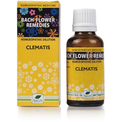 New Life Bach flower Clematis 30Â is a remedy used for treating people who find it difficult to live in the present. They are always living in a world made of their productions and imaginations and find it demotivating to live in the present. They always have a desire to wander to a nicer place.This daydreaming becomes a goal and a routine escape to everyday problems. When a person lives with “head separated from the body”, many problems like poor circulation, shuddering, inability to function in time occur which can be scary (in situations like giving an exam, crossing a street, giving an interview etc.)