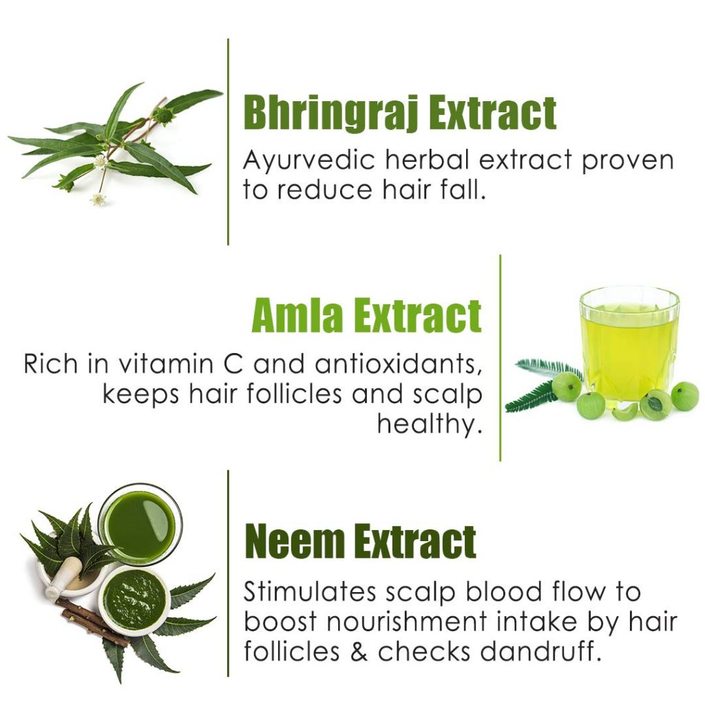 • Contains Ayurvedic Herbal Extracts – Bhringraj, Amla, Neem, Henna, Shikakai and Lemon – and Western Herbal Extracts– Biotin, Rosemary, Saw Palmetto and Niacin