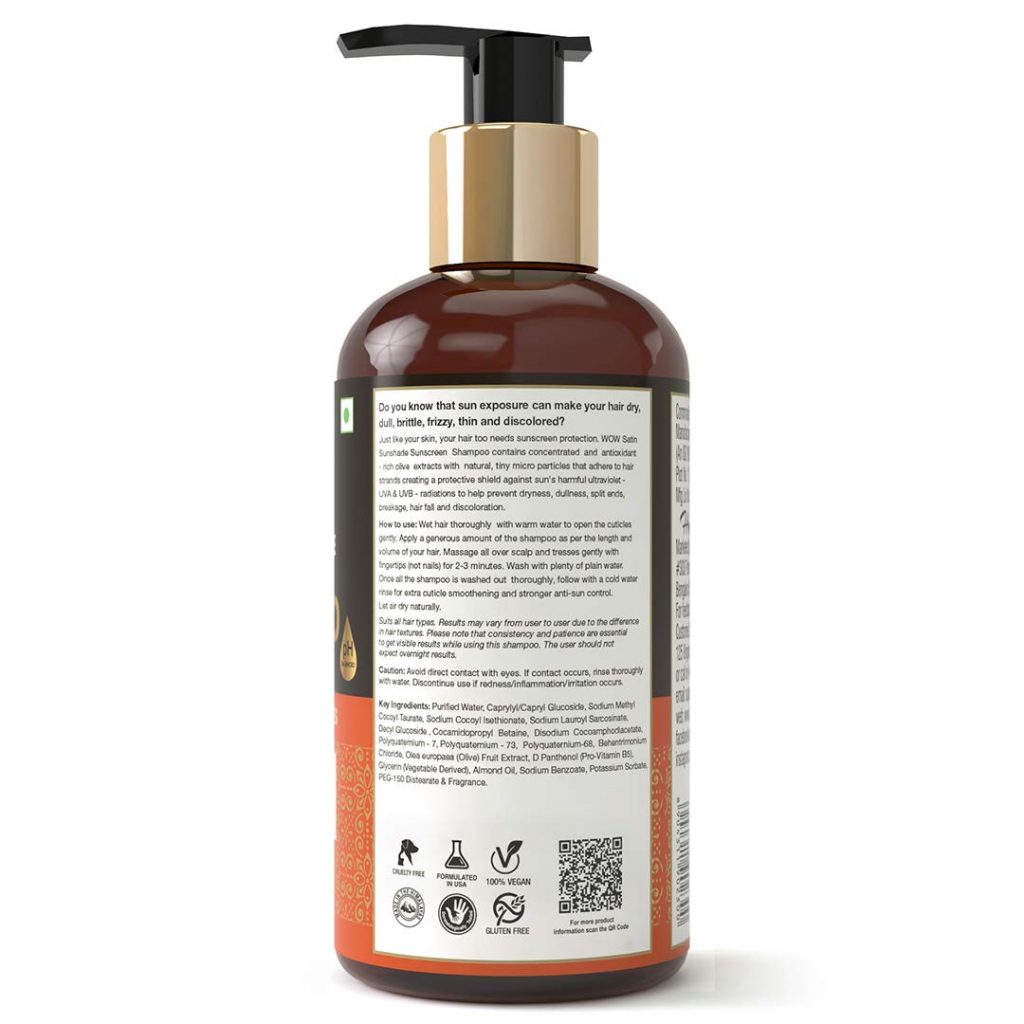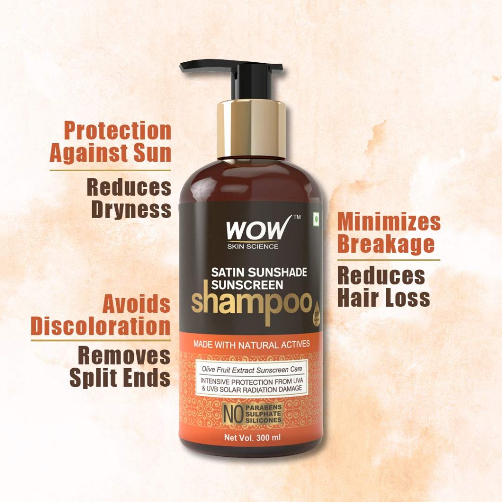 - Give your hair advanced protection from Sun’s harmful ultraviolet – UVA & UVB – radiations with wow skin science satin sunshade shampoo
