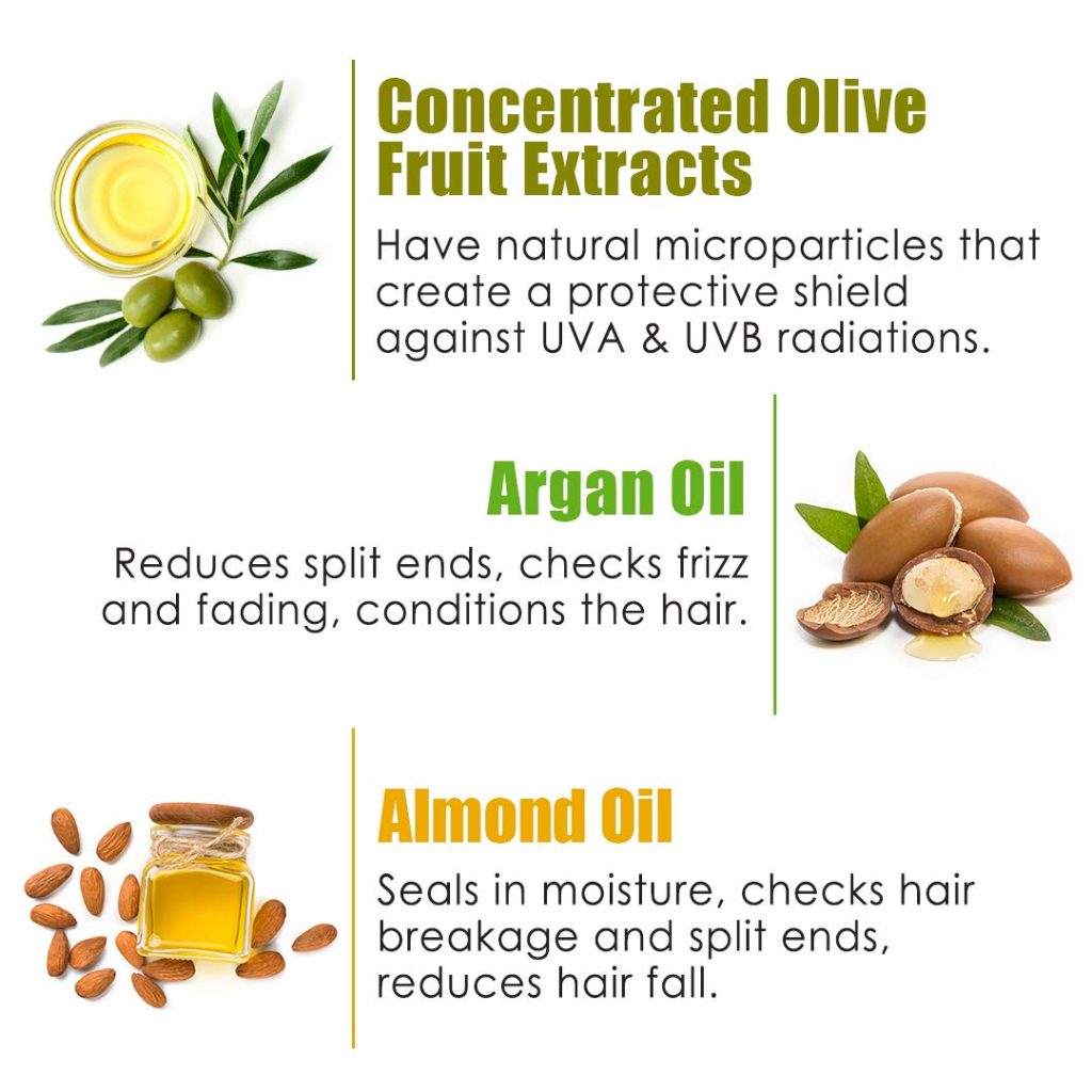 - Concentrated Olive Fruit Extracts : Have natural microparticles that create a protective shield against UVA & UVB radiations to stop dryness & discoloration.